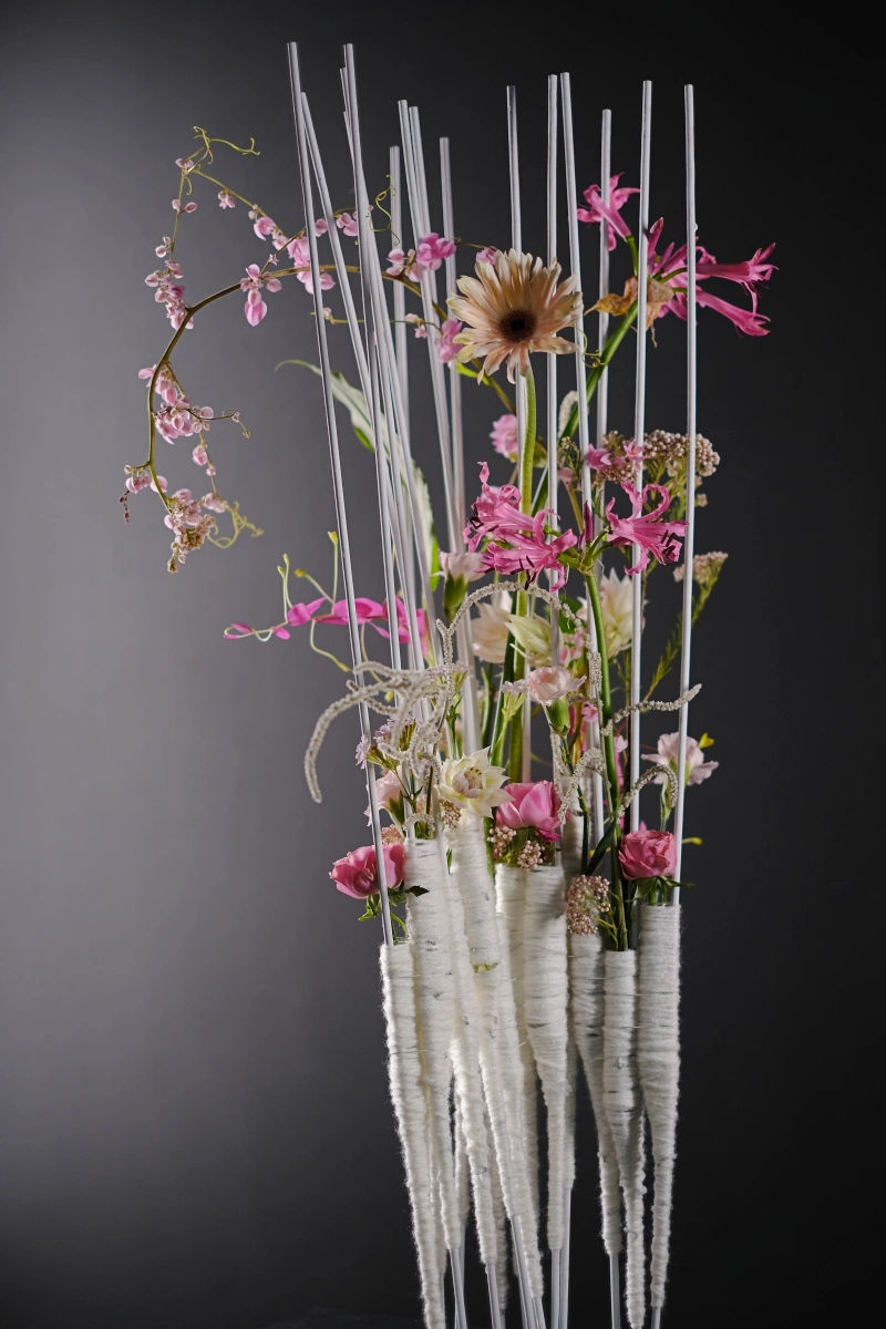直線結構真的是我目前的大魔王!只要碰上直線結構我就會腦子當機,應該要會的、知道的,都會瞬間遺失記憶,當天居然忘了花材可以與直線的結構相互連結,利用線條來延伸彼此,結果只一直滿心想著花毯的邏輯,上著上著就不小心把底部塞太滿…忘記需要利用他們去慢慢、層層推疊出的細緻的佈局。
